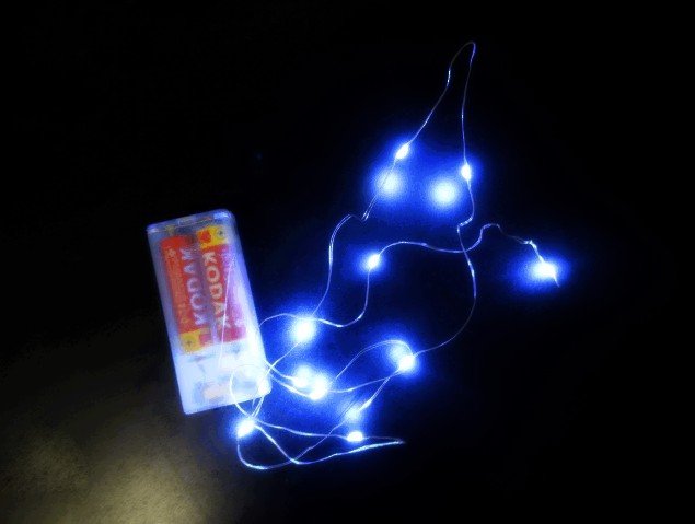 drátek s LED světly, délka 10 m, cca 100 LED světel na jednom drátku, na tři tužkové baterie (nejsou součástí balení)