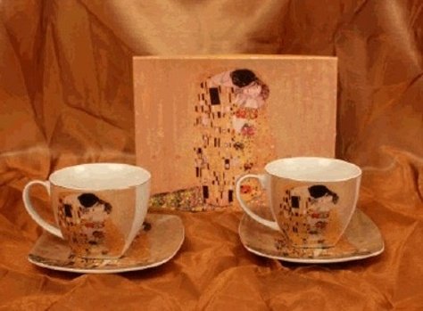 sada dvou šálků s podšálky - motiv Klimt - Polibek velikost presso